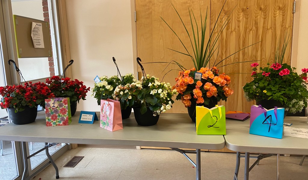 Clouds were threatening, but the Rain Gods gave us a break on the morning of Saturday May 17, for The Annual Plant, Bake and Yard Sale Fundraiser. Tomatoes, perennials and shrubs quickly sold out. Tasty baked goods and yard sale treasures were found and given a new purpose. Vince was a welcome vendor from Vinces Sharpening this year and was kept busy sharpening hand tools. Thank-you to all our members for your time, kind donations and support from the gardening community in making the event a great success. Many thanks to Century Gardens, Foodland, Vos and Food Basics  for your lovely donations of hanging baskets, planter and gift card for the Door Prize Table.