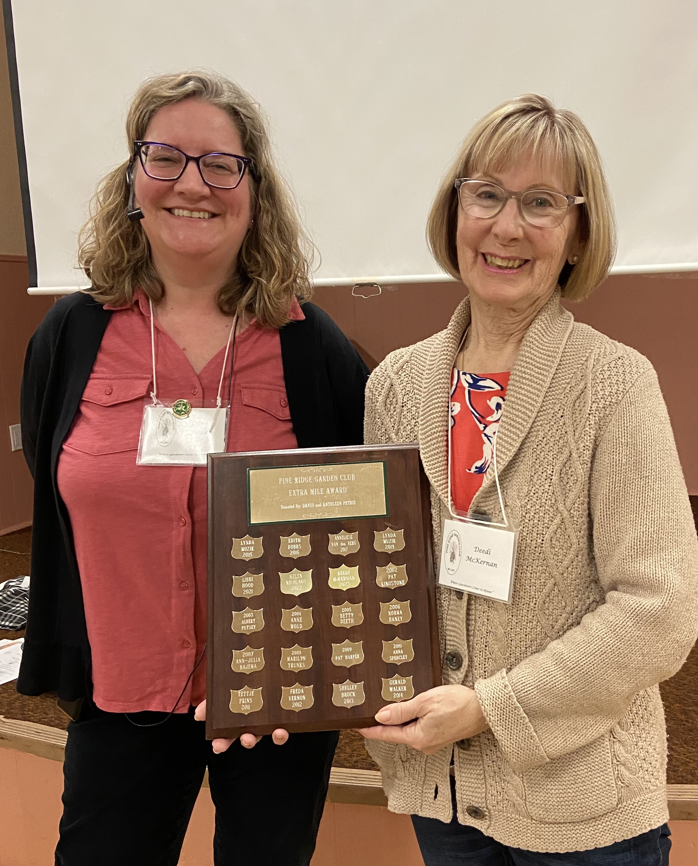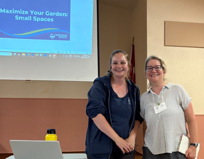 Avery from Vandermere Nursery speaking on “Maximizing your garden small spaces”. Our president Libbi is on the right.
