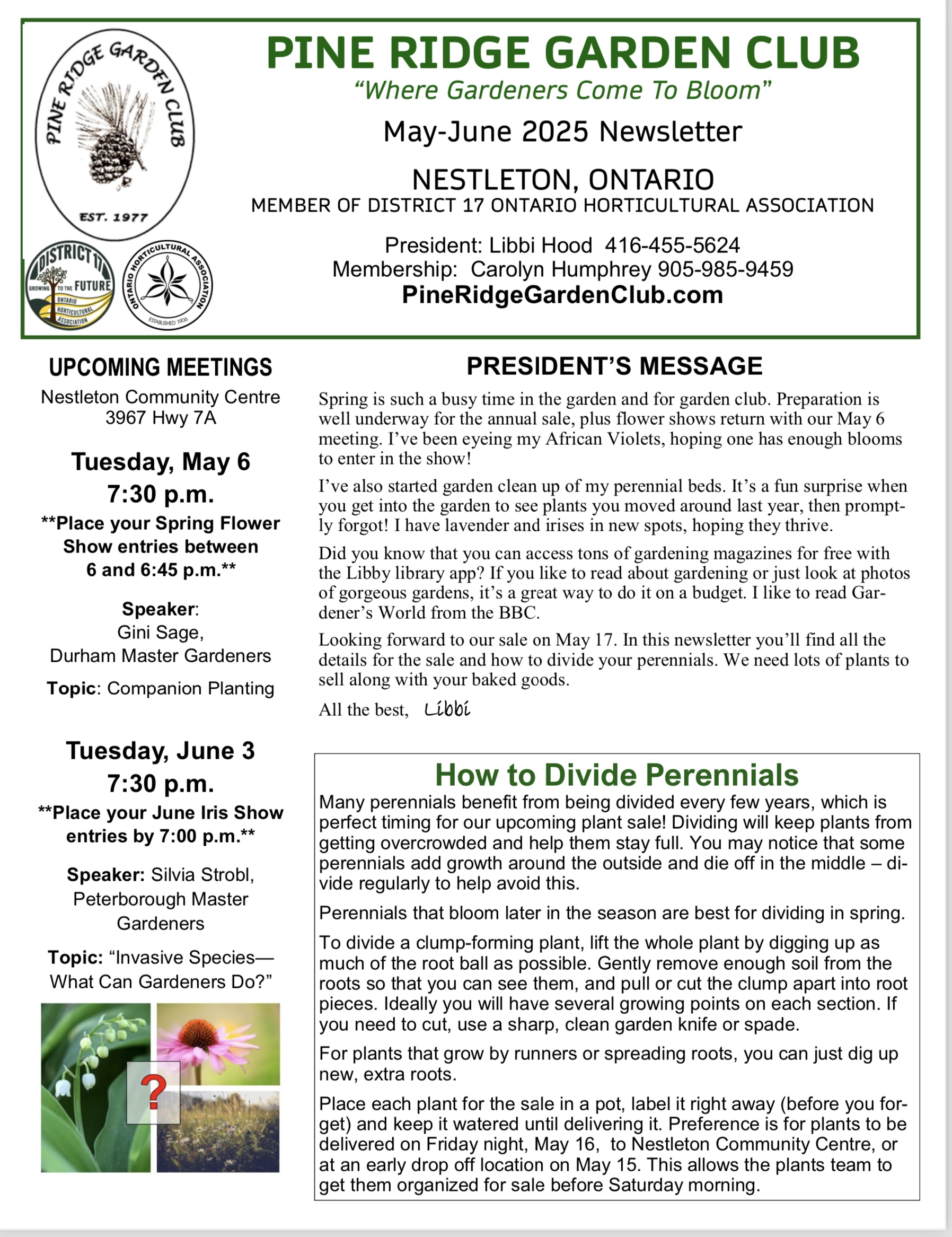 Coming up, Tuesday June 3 at 7:30, Silvia Strobl will speak on “Invasive Species- What can Gardeners Do?” Iris’ will be the Stars at “The June Iris Show.” New and Seasoned Members are encouraged to enter the show. Please place your entry in between 6:15-7:00. Judging will begin promptly at 7:15.  No stress, there will be assistants to help with filling out entry tags for placement of your specimens at the Workstation Table. Its fun to get involved, by sharing what you grow, we all learn from each other. Come out for an evening of Garden Info, see Shelley for Door Prizes, Carolyn to become a member, Goodies and Refreshments. Guests are Welcome
